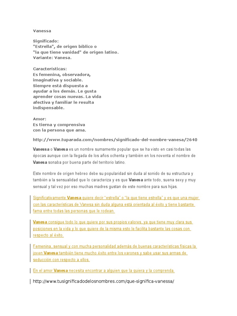 De acuerdo al significado de tu nombre eres. Los nombres tienen diferentes antecedentes algunos pueden provenir de cierto pueblo o región hay otros que incluso comparten dos o más acepciones con respecto a diferentes orígenes. Cuál es el día de Vanessa.